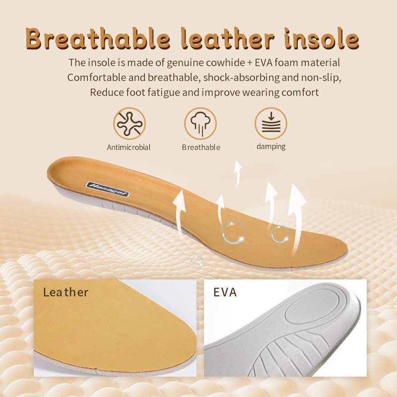 Echtes Rindsleder + EVA-Schaum-Einlegesohle – atmungsaktiv, stoßdämpfend und rutschfest. Sorgt dafür, dass sich die Füße Kilometer für Kilometer frisch anfühlen.