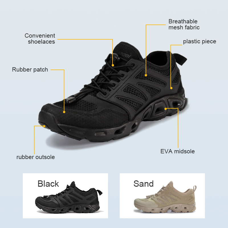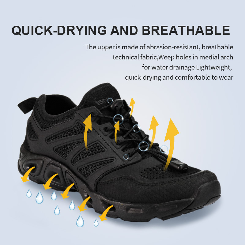 -Leicht und atmungsaktiv -Entwässerung und schnelles Trocknen -Stoßdämpfende EVA-Zwischensohle -Praktisches Schnürsenkel-Design