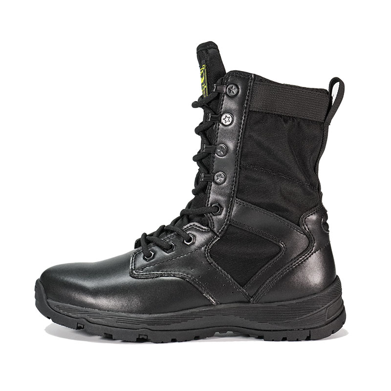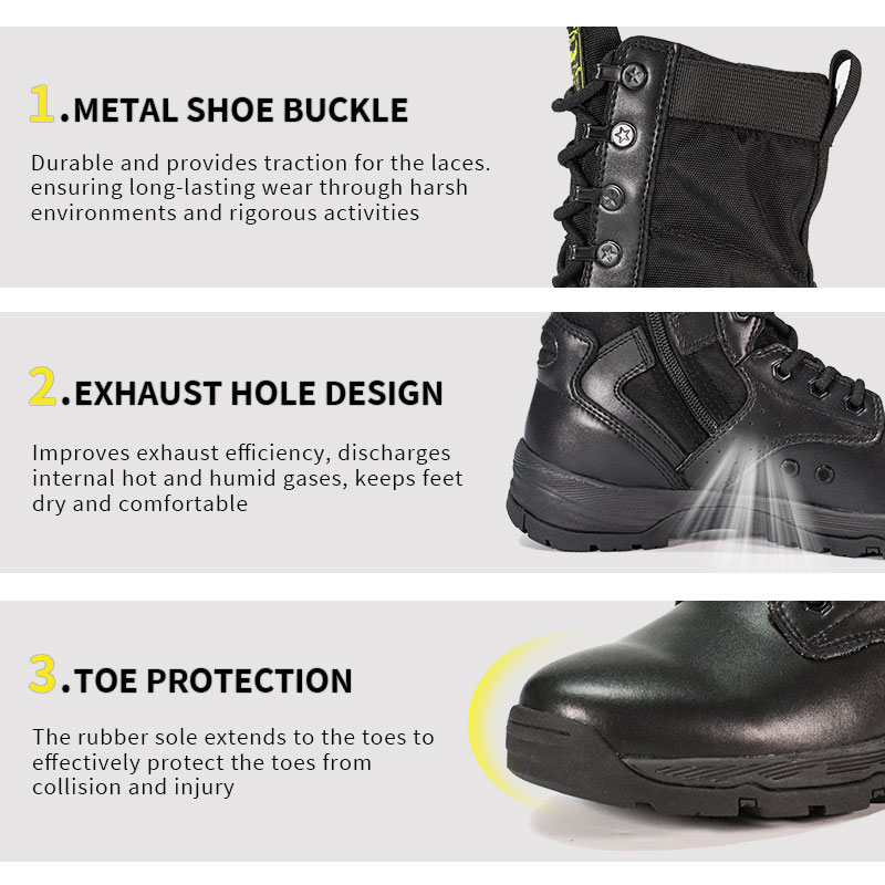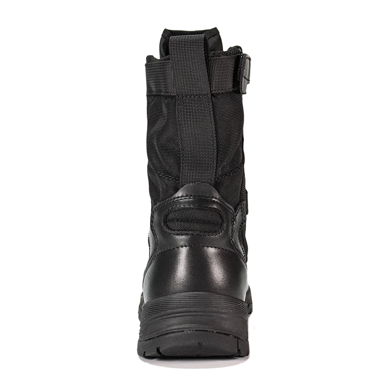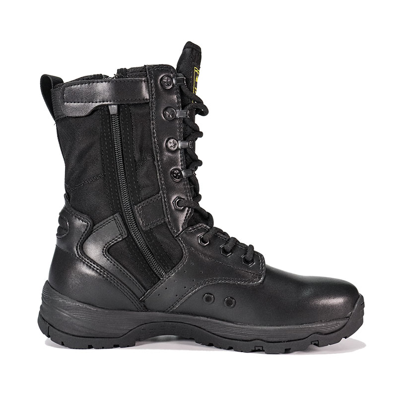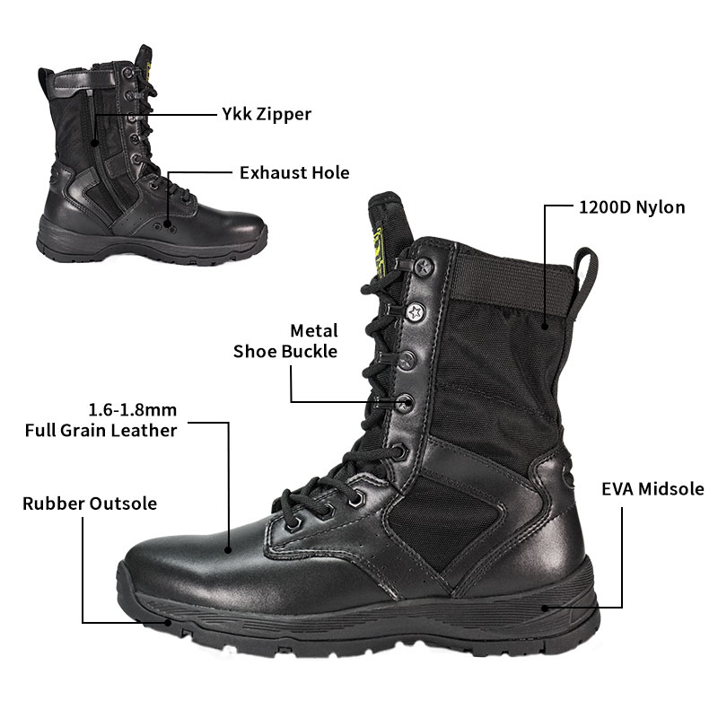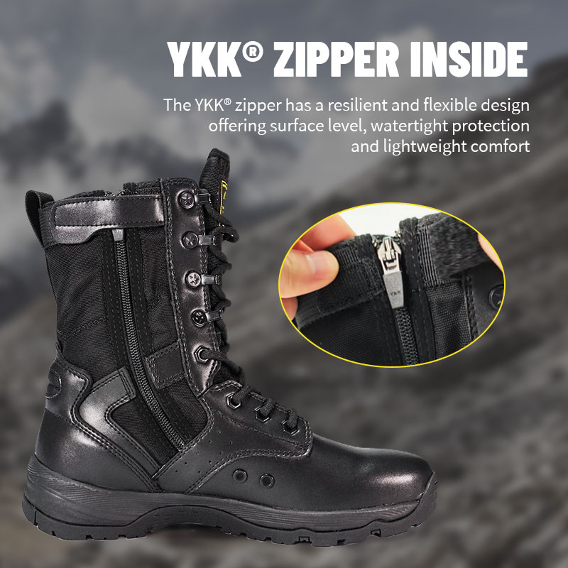 Die Polizeistiefel mit Vollgummi-Außensohle wurden für Militärangehörige und Outdoor-Enthusiasten entwickelt und bieten eine bequeme, umschließende Passform mit hervorragender Stabilität auf unebenem Gelände. Eine Zunge mit Zwickel hält Schmutz fern und bleibt zentriert, während das strapazierfähige Obermaterial aus Wildleder und Nylon rauen Bedingungen standhält. Der YKK-Reißverschluss erleichtert das An- und Ausziehen, sodass Sie sich auf die bevorstehende Mission konzentrieren können.