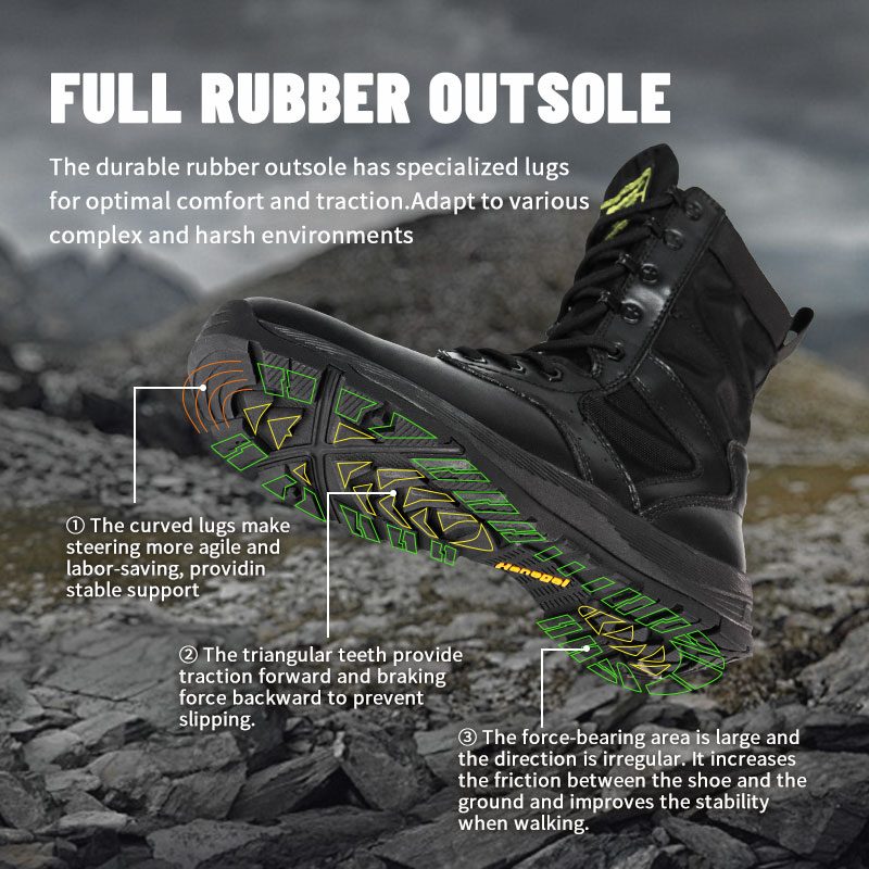 Die strapazierfähige Gummiaußensohle verfügt über spezielle Stollen für optimalen Komfort und Traktion. Passt sich an verschiedene komplexe und raue Umgebungen an